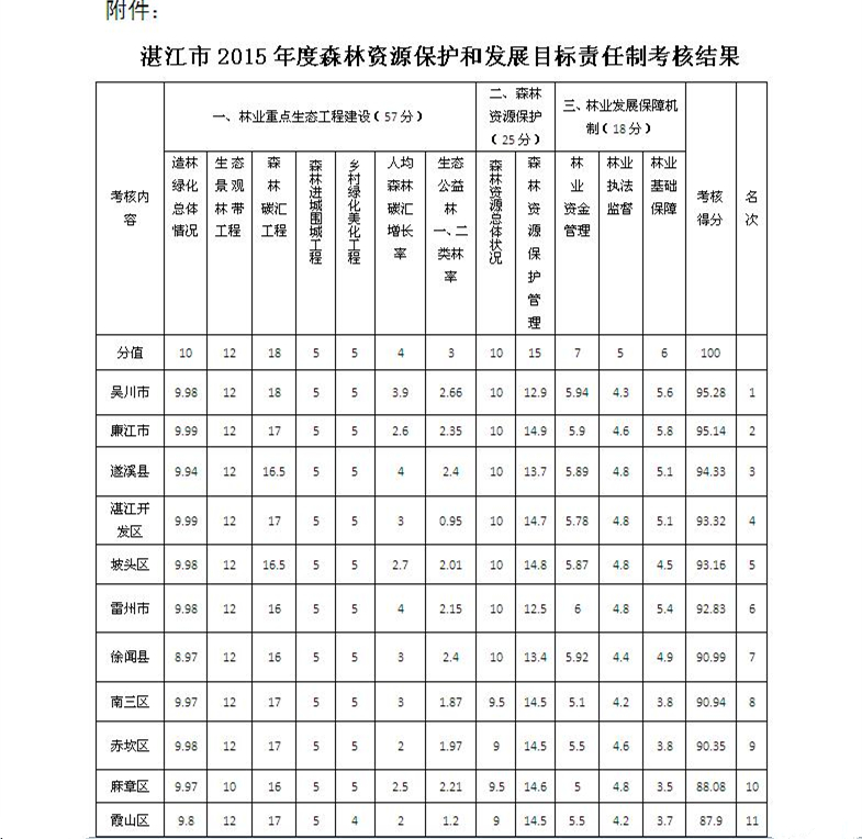 按照《广东省森林资源保护和发展目标责任制考核办法》、《广东省森林资源保护和发展目标责任制考核评分操作细则》和《双赢彩票(中国)开奖记录官网 办公室关于开展2015年度全市森林资源保护和发展目标责任制考核工作的通知》(湛府办函〔2015〕126号),我市开展了2015年度森林资源保护和发展目标责任制考核。经市人民政府同意,现将考核结果通报如下: