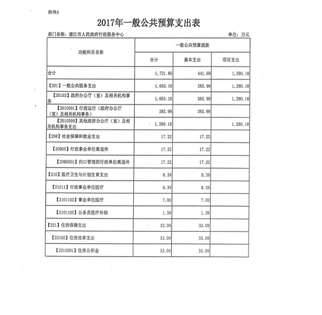 2017年支出预算2536.86万元,按经济分类划分,基本支出441.68万元,其中:工资福利支出284.02万元,对个人和家庭的补助94.34万元,商品和服务支出63.32万元;项目支出决算2095.18万元,主要支出项目有新办事大厅电费、物业管理费、租赁费以及12345热线平台建设经费等。
