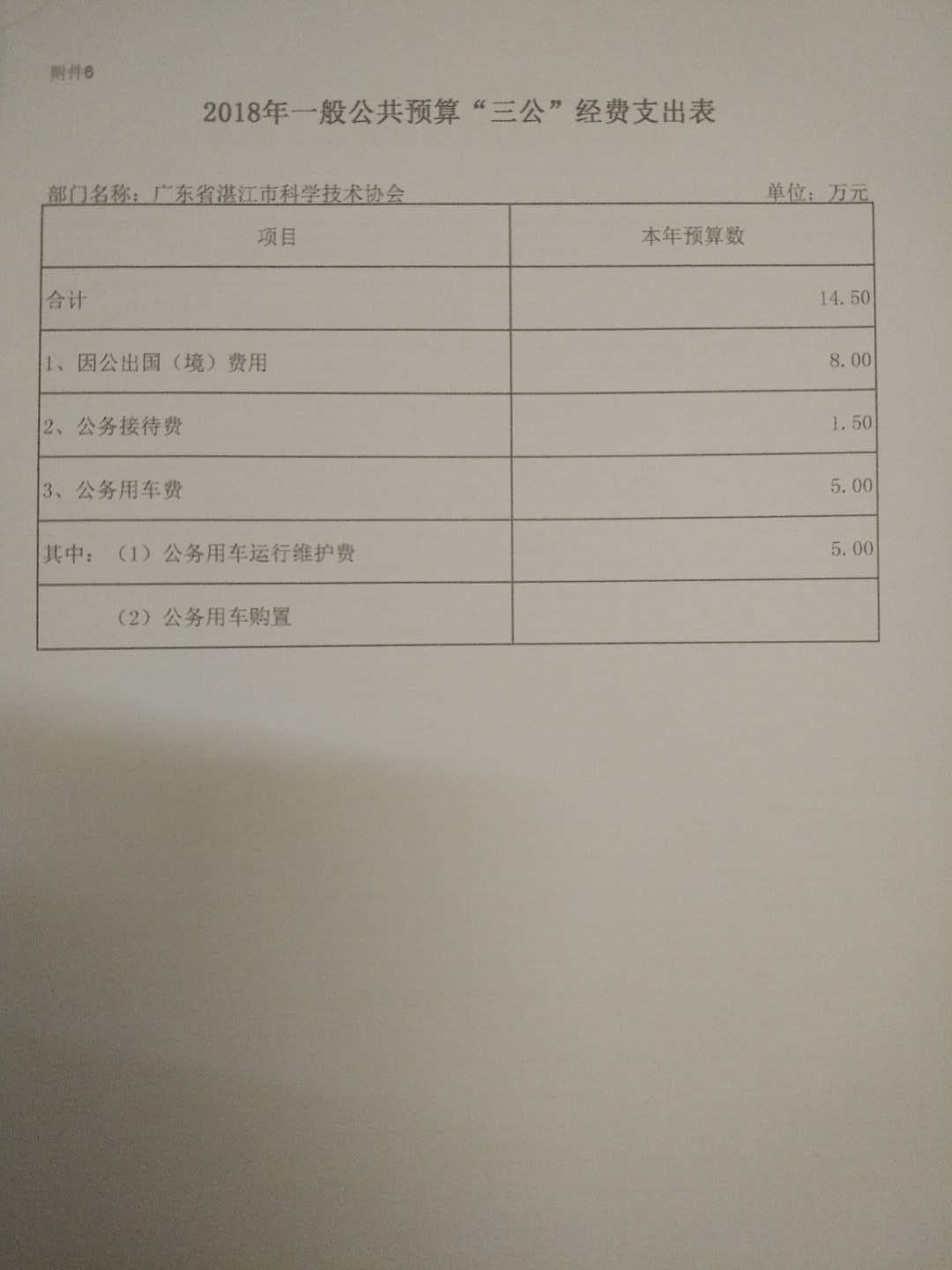 2018年我会一般公共预算“三公”经费支出14.5万元,1、因公出国(境)费用为8元;2、公务招待费为1.5万元;3、公车用车费⑴公车用车运行维护费5万元⑵公车用车购置费为0元。比上年度减少1万元,主要原因是我会力行减压,减少“三公”经费支出。