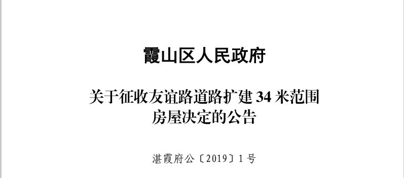 霞山区人民政府关于征收友谊路道路扩建34米范围房屋决定的公告