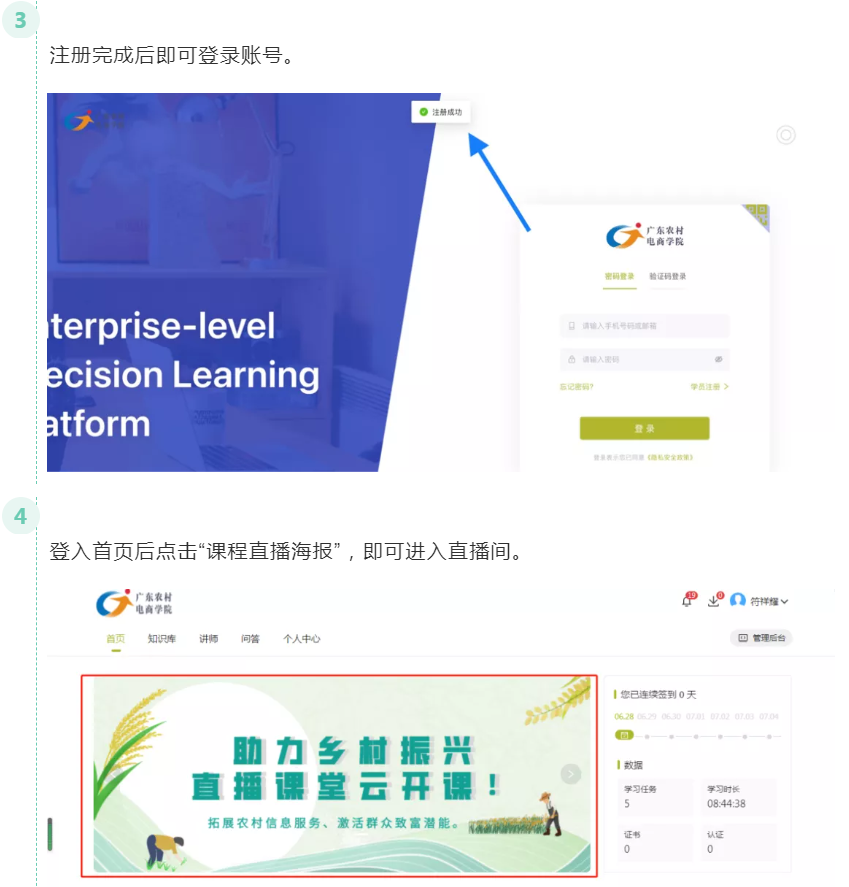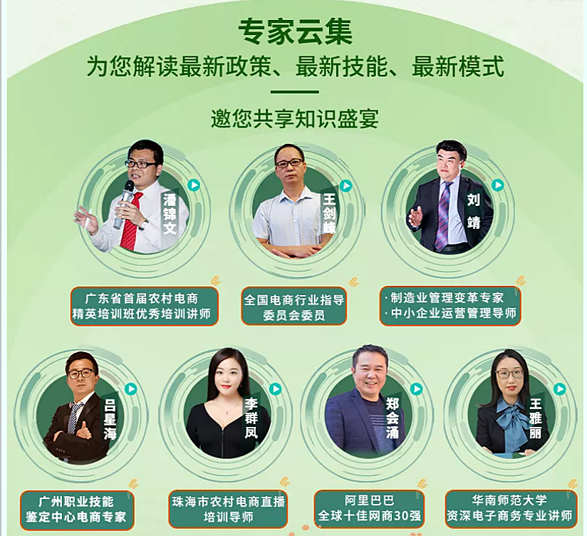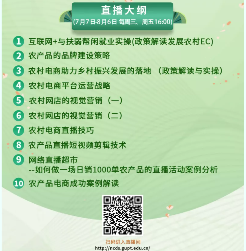为积极培育我省农村电商行业人才,促进“农村电商”工程高质量发展,助力乡村振兴,由广东省就业服务管理局联合省邮电职业技术学院打造的线上学习平台——广东农村电商网络学院,将于2021年7月7日-8月6日推出公益培训直播课堂。此次系列直播将每周三、周五16:00开课,以在线直播+录播回放、微课学习、专家在线答疑、农村电商行业资讯交流等方式进行。