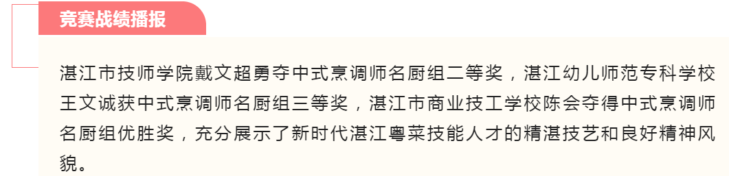 本届活动亮点纷呈、成果丰硕,对全省“粤菜师傅”工程实践成果进行了一次全面检阅和展示,我市代表团参赛选手努力拼搏、奋勇争先,大力弘扬精益求精的工匠精神,赛出了水平。