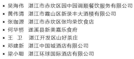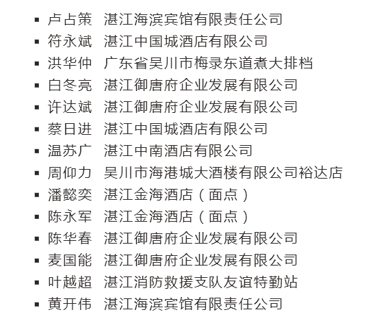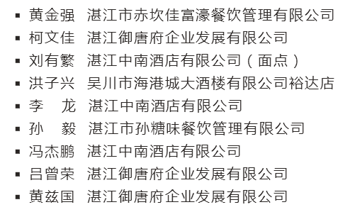 广东省三星级“粤菜师傅”(7人) 广东省二星级“粤菜师傅”(14人) 广东省一星级“粤菜师傅”(9人)