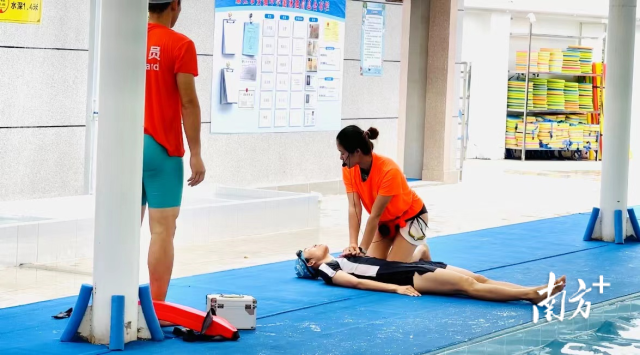 “3、2、1,走!保护手部和腰部,摆放体位,清理口腔异物,检查呼吸,胸外按压……”游泳池内,救生员跟随口令将“溺水者”施救上岸后进行游泳救生心肺复苏,流程顺畅,动作娴熟。