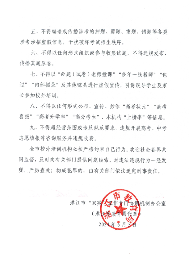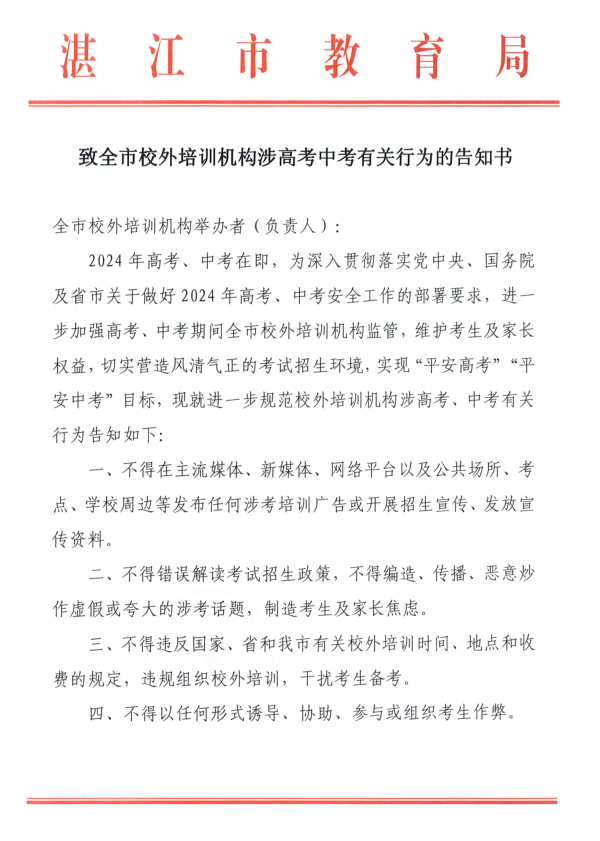 致全市校外培训机构涉高考中考有关行为的告知书