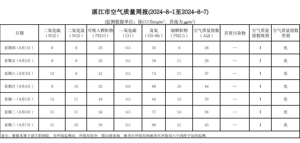 双赢彩票(中国)开奖记录官网 空气质量周报(2024-8-1至2024-8-7)