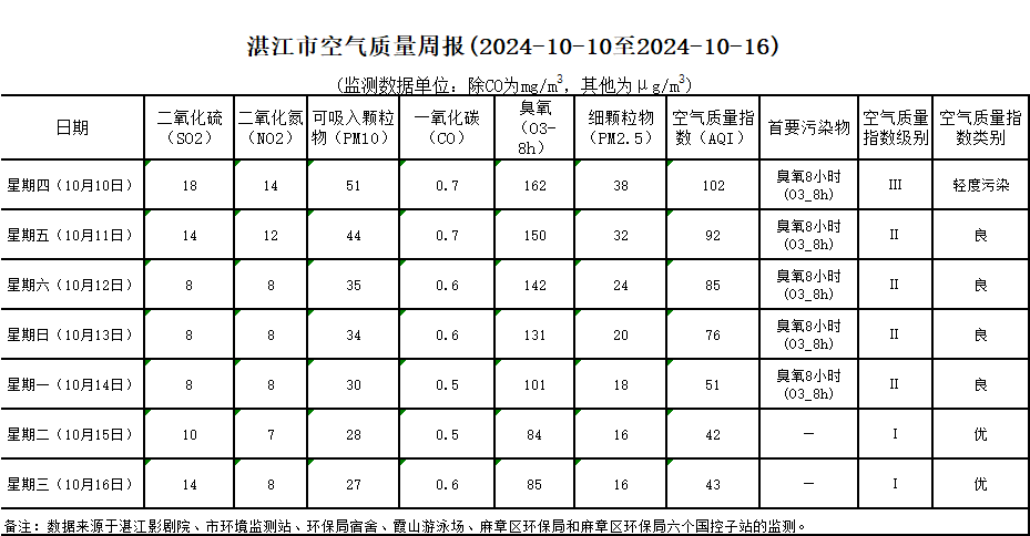 双赢彩票(中国)开奖记录官网 空气质量周报(2024-10-10至2024-10-16)