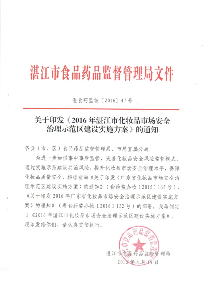 关于印发《2016年双赢彩票(中国)开奖记录官网 化妆品市场安全治理示范区建设实施方案》的通知