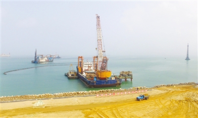 中科炼化码头建设现场,近岸处一艘装卸船将桩基、沉箱等施工机具卸到指定区域。 本报记者 吴智恒 刘冀城 航拍