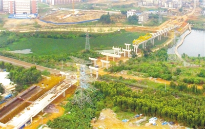 南方路跨线桥桥面搭建完成一半