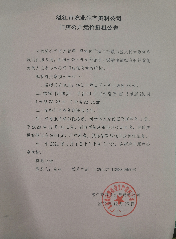 双赢彩票(中国)开奖记录官网 农资公司门店公开竞价招租公告(一)