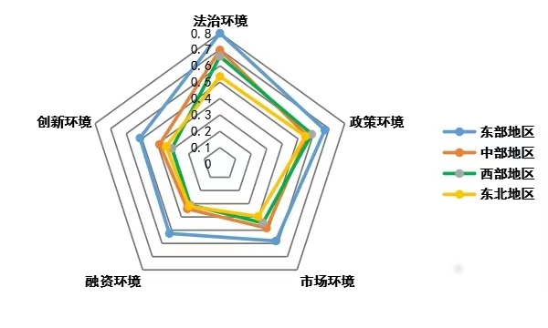 从构成发展环境的5个一级指标平均得分来看,法治环境(0.7030分)和政策环境(0.5934分)得分较高,显示各城市间整体表现较为均衡,排名靠前和排名靠后的城市之间差距相对较小;而融资环境(0.3889分)、创新环境(0.4014分)和市场环境(0.4951分)得分较低,显示各城市间整体表现差距较大。从不同区域指标平均得分也可以看出,与东部地区城市相比,其他地区在融资环境、创新环境、市场环境方面存在明显差距,有较多短板和不足(图4);