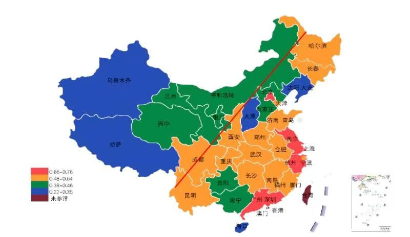 四是中小企业发展环境与人口密度和城镇化水平密切相关。综合得分排名前10位的城市中,有9个位于“胡焕庸线”东南方向,其共同特点是人口密度较大、城镇化水平较高、有较好的经济金融基础,中小企业的数量和质量普遍较高。而位于“胡焕庸线”西北方向的城市,创新能力和投入相对不足,中小企业不论从数量还是发展质量,与经济发达城市相比都有着较大差距(图5)。