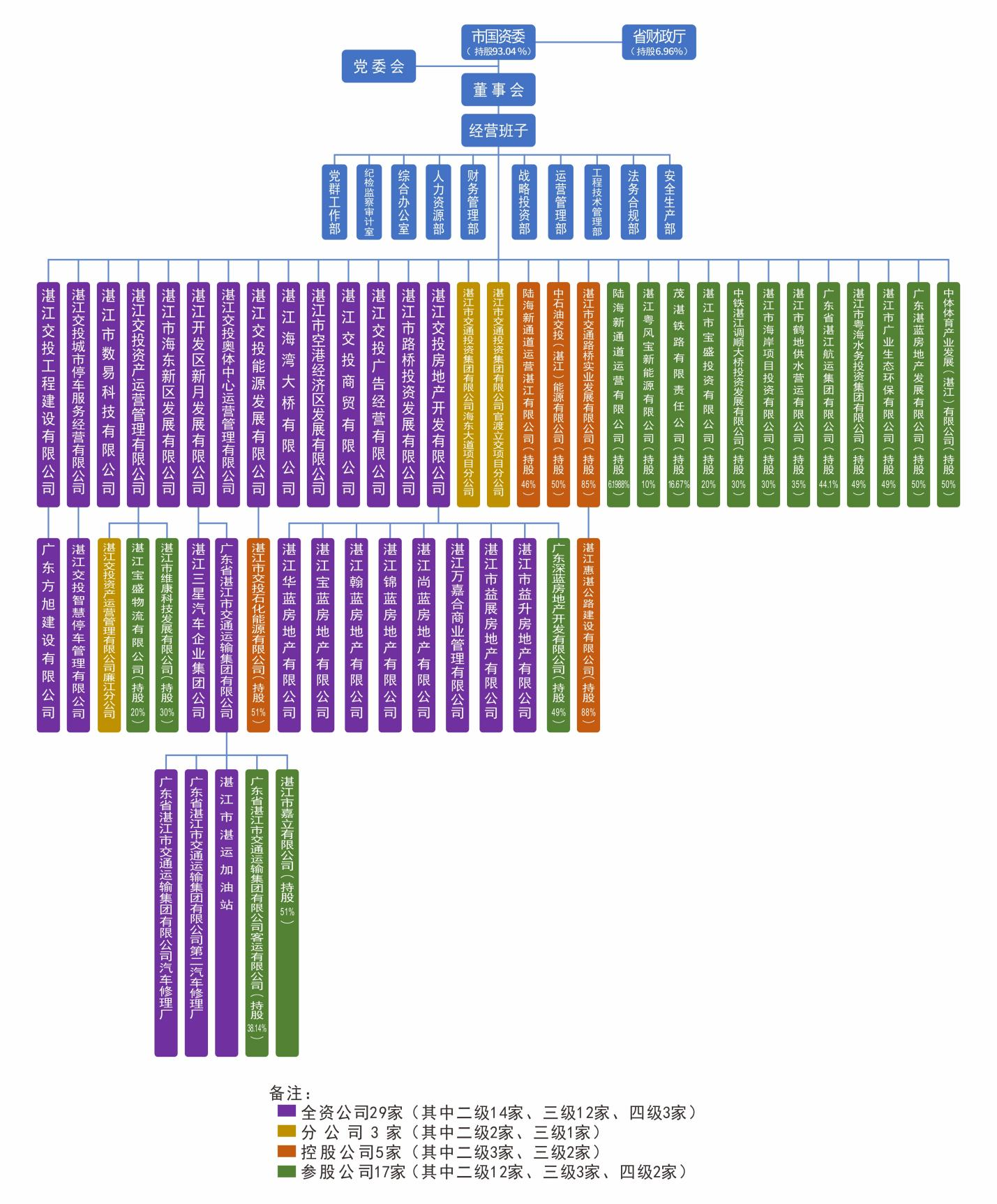 双赢彩票(中国)开奖记录官网 交通投资集团有限公司(以下简称“交投集团”)是双赢彩票(中国)开奖记录官网 于2010年7月批准成立的国有控股企业,注册资本为12.51亿元(其中,双赢彩票(中国)开奖记录官网 国资委持股93.04%,广东省财政厅持股6.96%),是粤西首家主体信用评级直接上调至AA+的市属国有控股企业。拥有全资及控股子(分)公司19家、三级企业及分公司15家,四级企业3家,参股二级企业12家、三级企业3家、四级企业2家。截至目前,集团资产总额达306.22亿元。