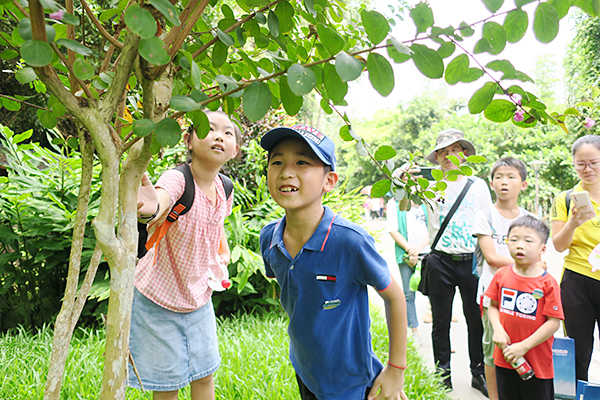 户外活动中,动植物导赏员带领孩子沿着玛珥湖边考察植物生长的情况,讲解各种植物的名称和分布特点,各种有趣的植物引起了大人和孩子的浓厚兴趣。