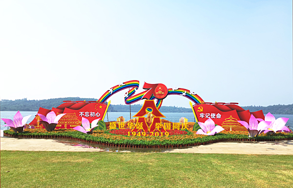 为庆祝新中国成立70周年和宣传“不忘初心、牢记使命”主题教育,湖光岩风景区以“盛世华诞、举国同庆”和“不忘初心、牢记使命”为主题打造了独具特色的花展。花展位于景区湖滨广场中央,以淡蓝色的玛珥湖、翠绿色的狮子岭、碧蓝色的晴空为背景,游客们可以在这里尽情地拍照留念。此外,景区东门龙鱼神龟、博物馆、地震馆、楞严寺、望海楼等景点也值得您倾情一游。