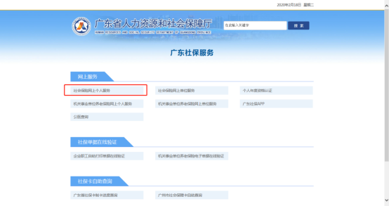 点击→社会保险网上个人服务→进入广东省人力资源和社会保障厅网上服务平台,如下页面↓