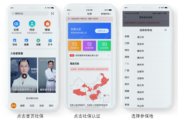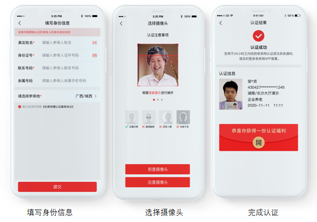 2、下载“老来“APP→双赢彩票社保→社保认证→选择参保地→填写身份信息→选择摄像头→进行人脸识别→完成认证