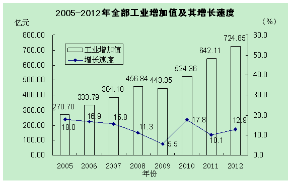 全年全部工业完成增加值724.85亿元,比上年增长12.9%。规模以上工业企业实现增加值581.41亿元,增长12.1%;其中:国有及国有控股企业实现增加值133.55亿元,增长5.1%;股份制企业实现增加值162.48亿元,增长45.2%;外商及港澳台企业实现增加值