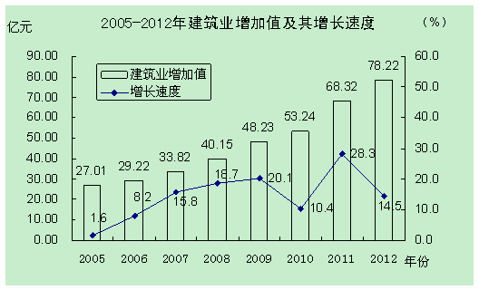 全年建筑业增加值78.22亿元,比上年增长14.5%;全市资质等级以上建筑企业116家,实现总产值247.05亿元,比上年增长20.9%;实现利润总额5.15亿元,增长20.0%。房屋建筑施工面积2916.4万平方米,增长20.5%。