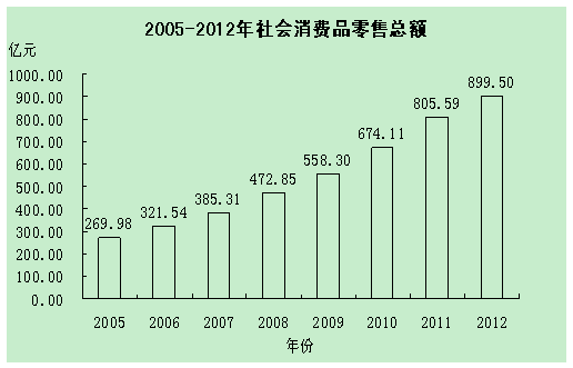全年社会消费品零售总额899.50亿元,增长12.1%,扣除物价因素,实际增长10.0%。其中,城镇消费品零售额795.96亿元,占全市社会商品零售额的88.5%,增长15.2%;乡村消费品零售额103.54亿元,占全市商品零售总额的11.5%,下降7.2%。分行业看,批发业零售额87.22亿元, 增长14.0%;零售业零售额692.51亿元,增长11.6%;住宿业零售额8.81亿元,增长12.4%,餐饮业零售额110.96亿元,增长13.6%。