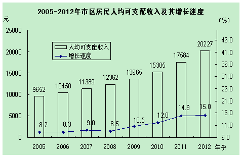 全年市区居民人均可支配收入20227.32元,增长15.0%。市区居民恩格尔系数为41.8%,比上年下降0.2个百分点。市区居民人均住房建筑面积30.06平方米,比上年增加0.65平方米