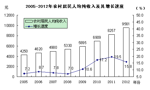 全年农村居民人均纯收入9561元,增长15.8%。农村居民恩格尔系数为51.2%,比上年下降了1.2个百分点。