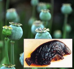 鸦片 俗称大烟, 也叫阿片,阿芙蓉,是催眠性罂粟壳植物的凝结计,药物有止泻、止咳和镇静作用。罂粟花落后结出球形成椭圆形蒴果,流出白色的汁液,干燥凝结后即为生鸦片。经过加工的熟鸦片吸食时有一种强烈的香味,初次吸食时会感到头晕目眩、恶心或头痛,多次吸食就会上瘾。