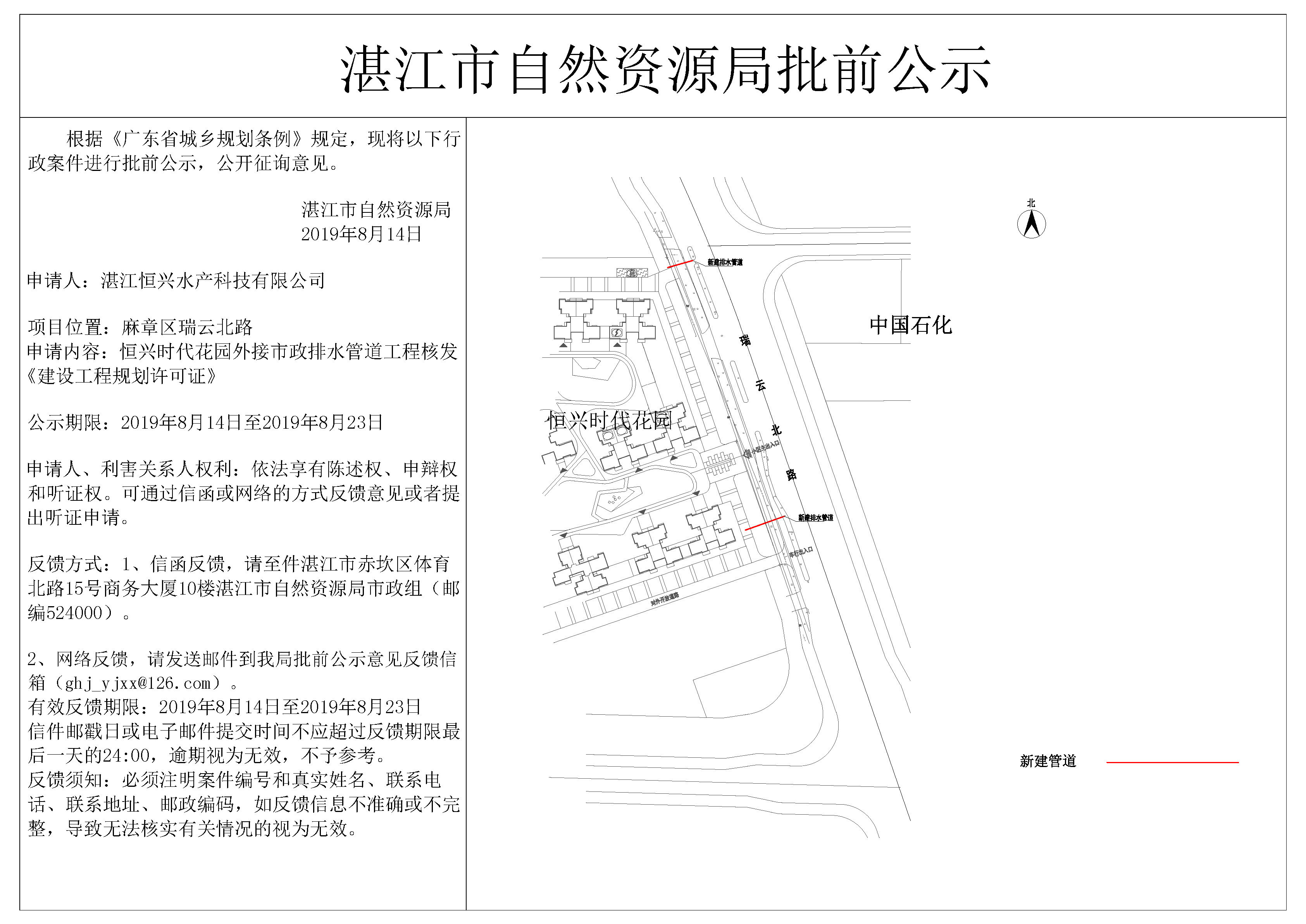 恒兴时代花园外接市政排水管道工程核发《建设工程规划许可证》批前公示