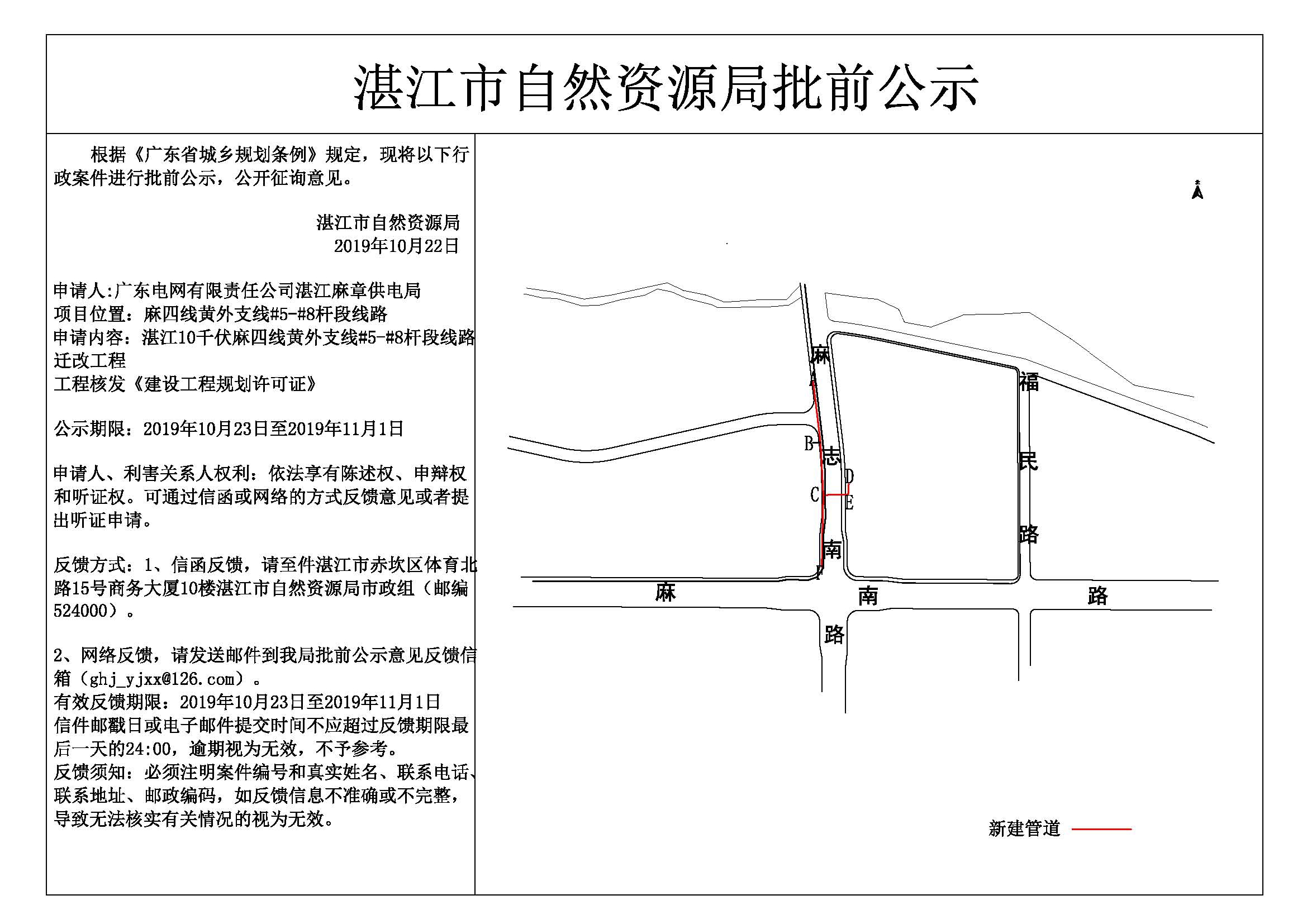 双赢彩票10千伏麻四线黄外支线#5-#8杆段线路迁改工程核发《建设工程规划许可证》批前公示