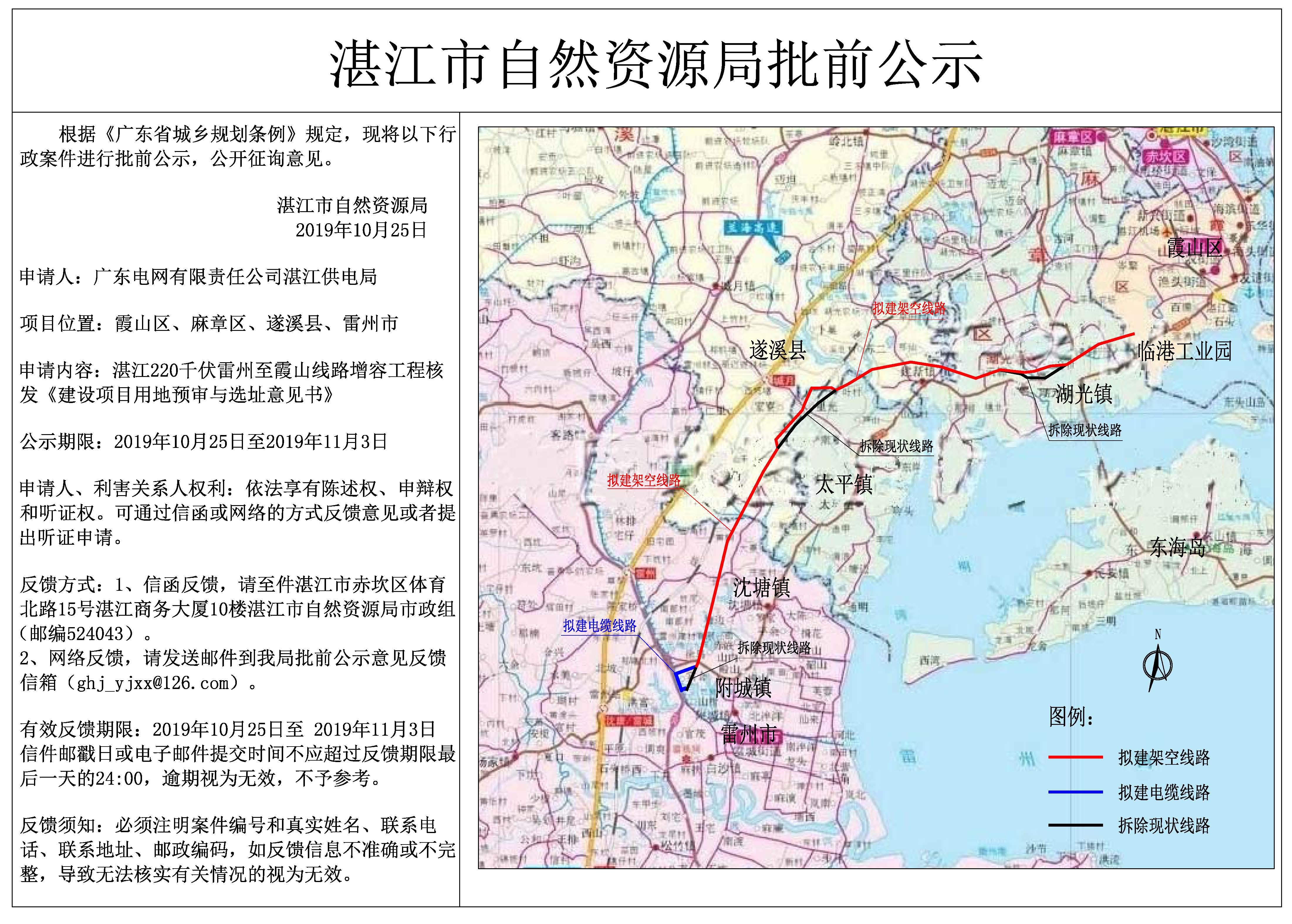 双赢彩票220千伏雷州至霞山线路增容工程核发《建设项目用地预审与选址意见书》批前公示
