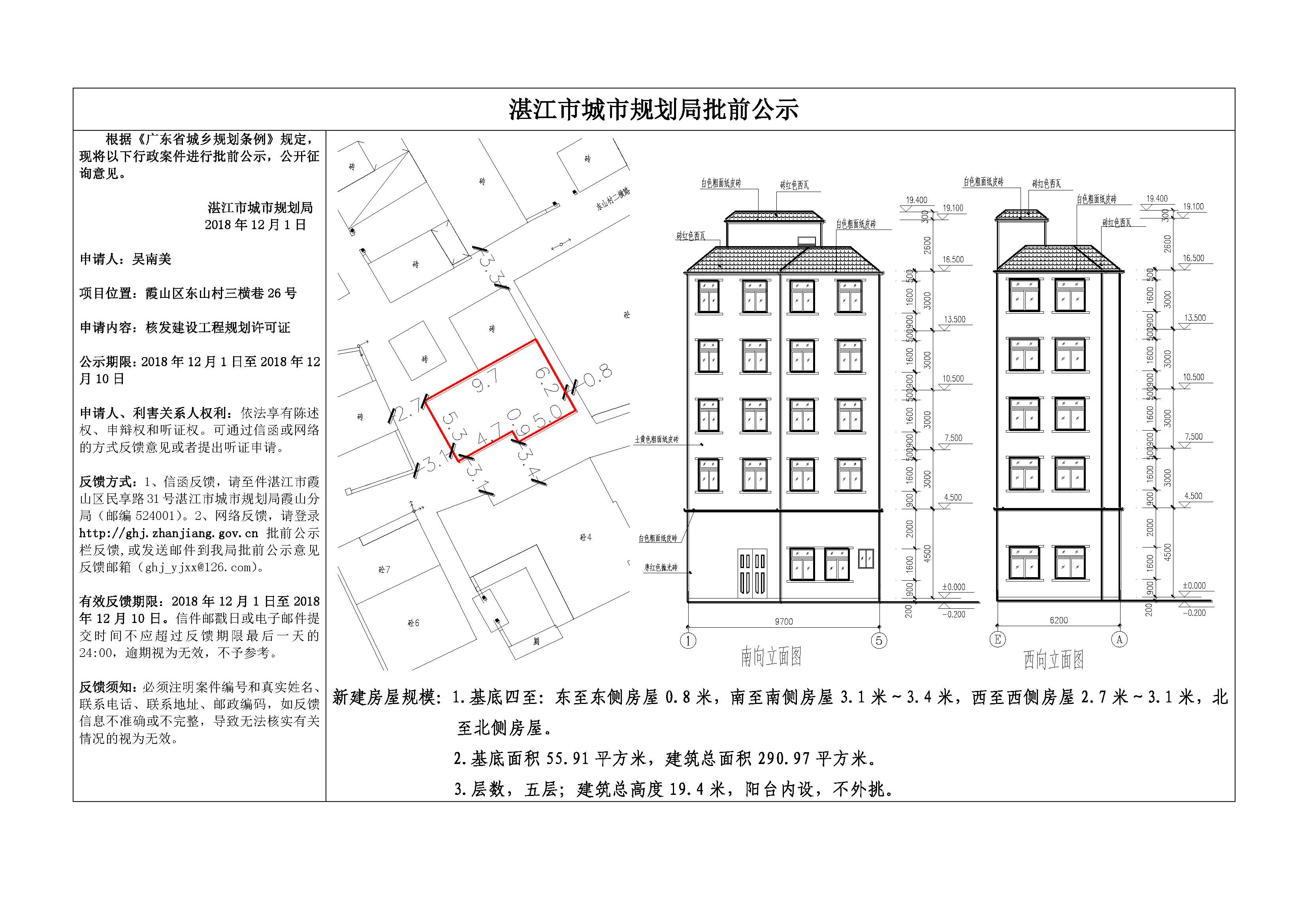 (吴南美)核发建设工程规划许可证批前公示(东山村三横巷26号)