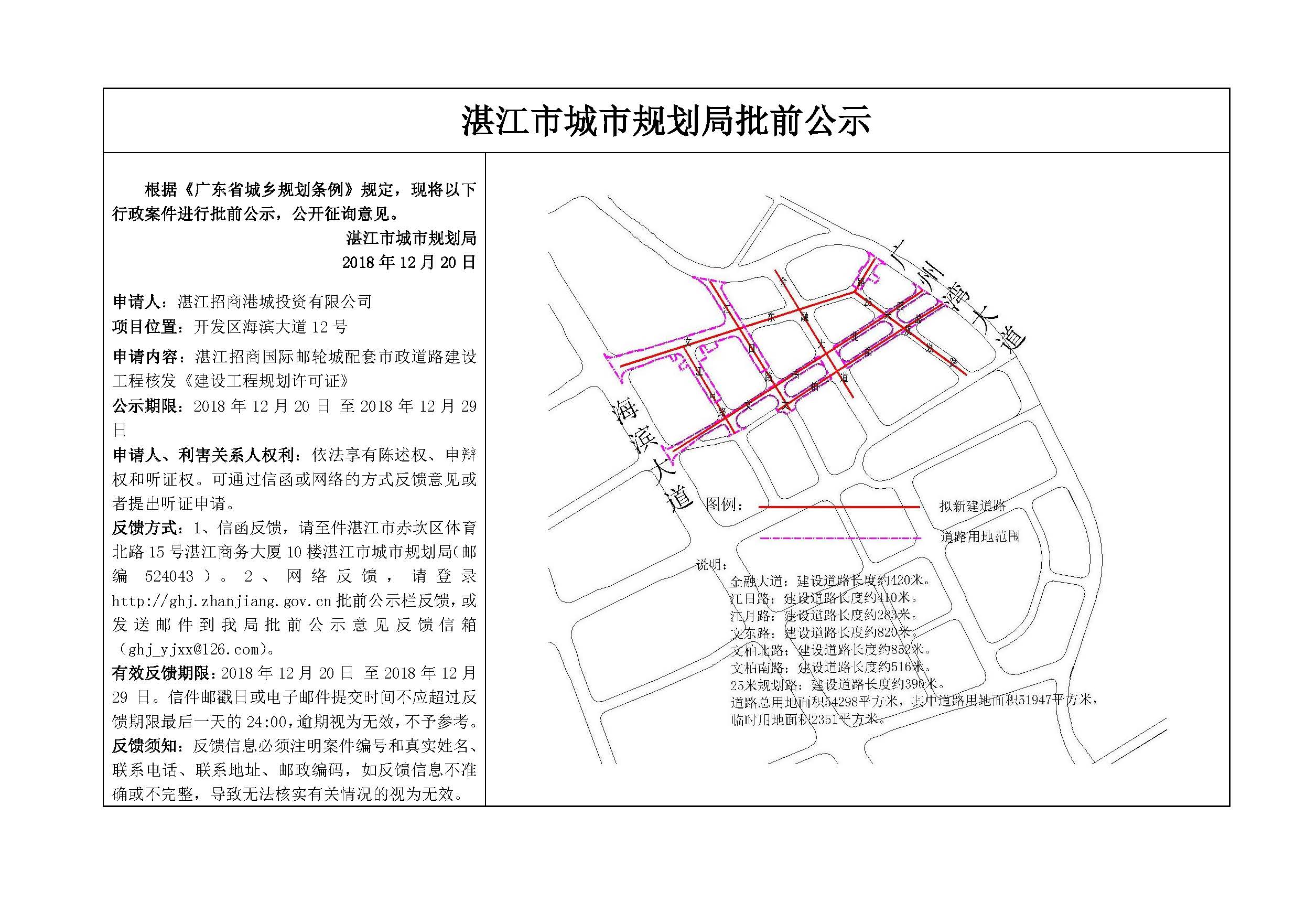 双赢彩票招商国际邮轮城配套市政道路建设工程核发《建设工程规划许可证》批前公示