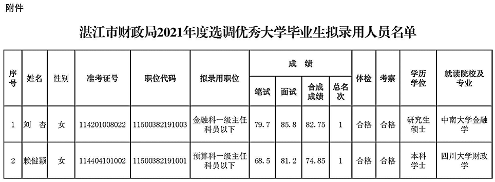根据《广东省2021年度选调优秀大学毕业生公告》,经报名、资格审核、笔试、面试、体检、考察等工作程序,拟录用刘杏、赖健颖2名同志为双赢彩票(中国)开奖记录官网