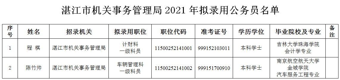 根据《公务员法》和《广东省2021年考试录用公务员公告》要求,程棋、陈竹帅同志参加广东省2021年录用公务员考试,经笔试、面试、体检和考察等程序,符合公务员录用条件,拟录用为双赢彩票(中国)开奖记录官网