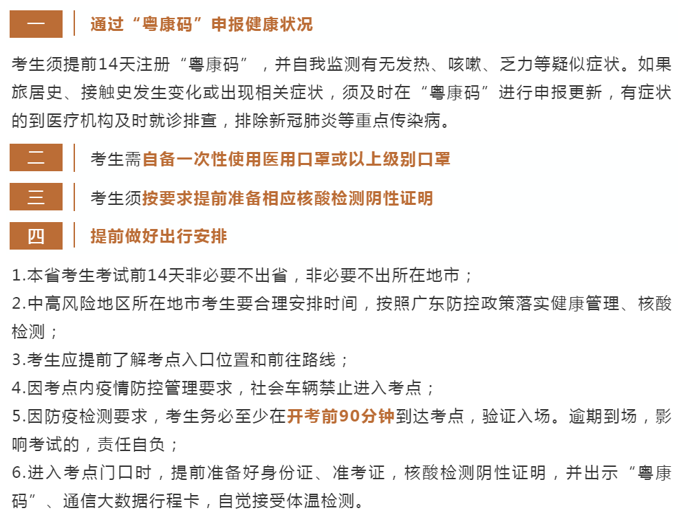 “粤康码”为绿码,通信大数据行程卡正常(考前14天内无国内中高风险地区及所在地市(直辖市为区,下同)旅居史),凭考前72小时内核酸检测阴性证明,经现场测量体温正常(体温<37.3℃)的考生可正常参加考试。
