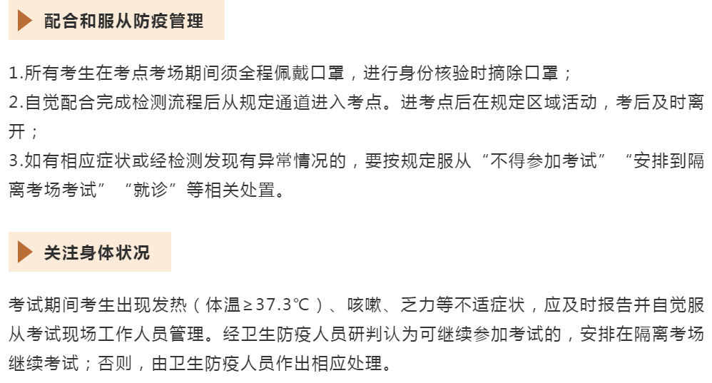 3.现场测量体温不正常(体温≥37.3℃),在临时观察区适当休息后使用水银体温计再次测量体温仍然不正常的,考生近14天无中高风险地区所在地市旅居史,先在隔离考场考试再检测核酸;